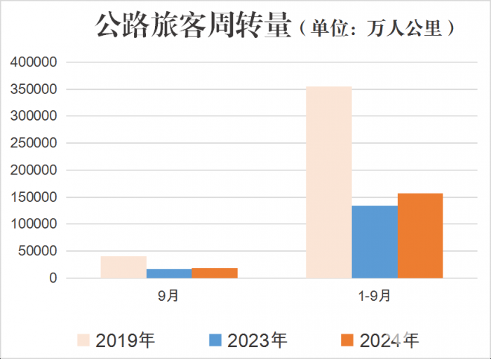 9月完成公路旅客周转量18647.48万人公里,比2023年同期增长15.9%,比2019年同期下降53.5%。
