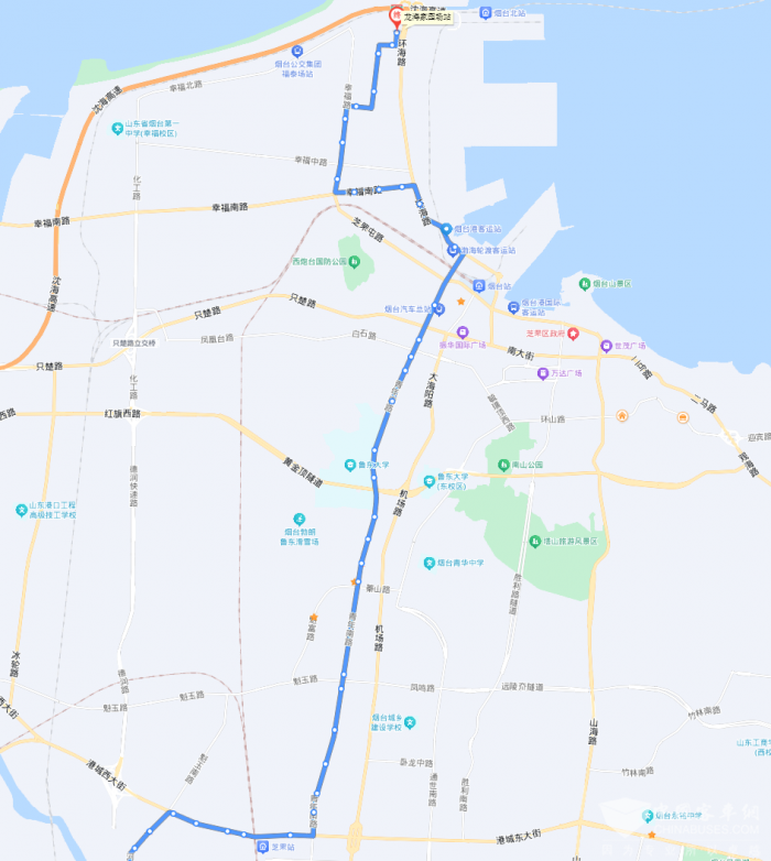 (一)线路走向由芝罘站广场发车,沿芝罘站路、港城西大街、青年南路、青年路、环海路、幸福南路、幸福路、幸福东路、龙海路、幸福北路至龙海家园场站。