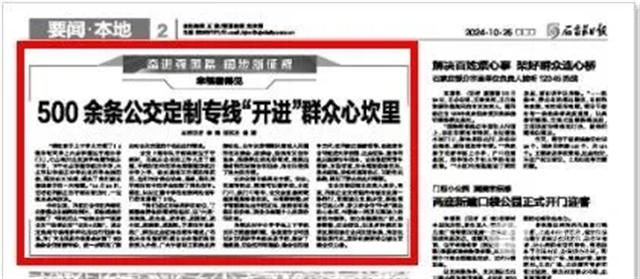 2024年以来,石家庄公交在持续优化常规公交线网的同时,积极探索并构建了“网约巴士”“定制公交”“巡游公交”“县域公交”“公交+文旅”,及公交机场专线等多样化的出行服务体系,为广大市民及企业量身定制了500余条公交定制专线,进一步满足了群众对公共交通的个性化出行需求。