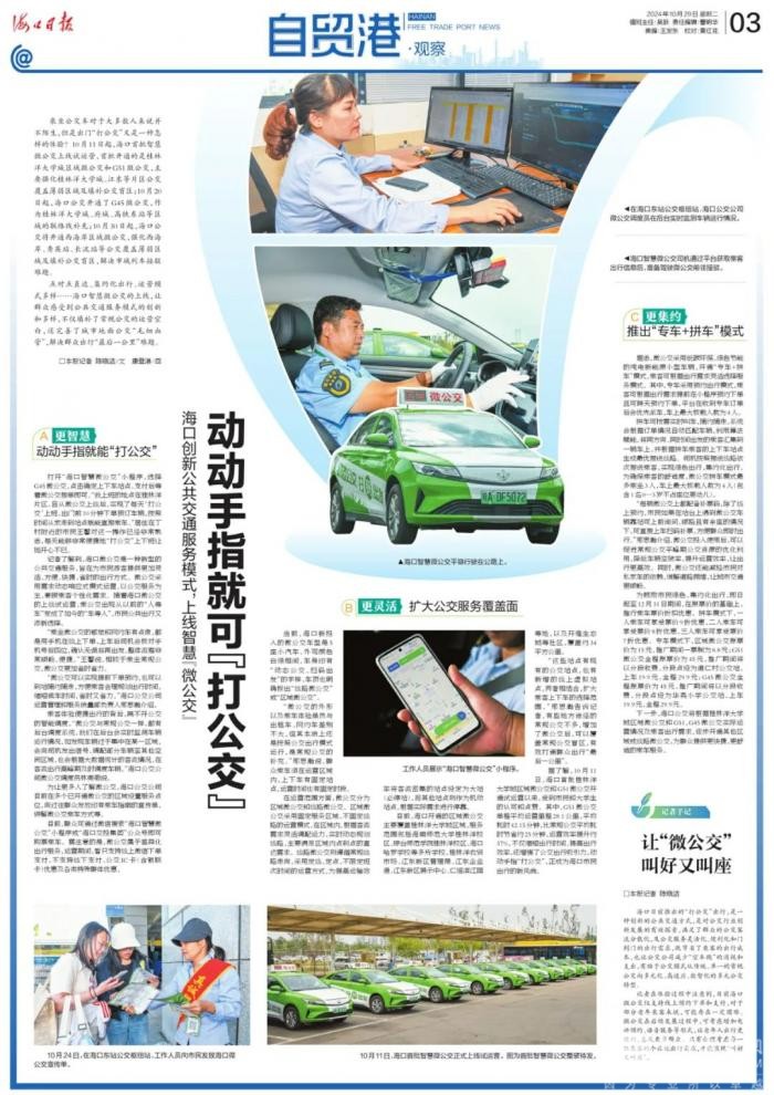 点对点直达、集约化出行、运营模式多样……海口智慧微公交的上线,让群众感受到公共交通服务模式的创新和多样,不仅填补了常规公交的运营空白,还完善了城市地面公交“毛细血管”,解决群众出行“最后一公里”难题。