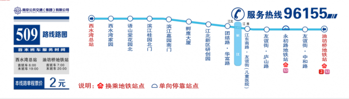 509路由西水湾总站发车,途经江心洲大桥,最终到达油坊桥地铁站。509路的开通,填补了江心洲长江大桥沿线多处公交空白,与地铁2号线、7号线、S3号线无缝衔接,江北区域的市民通过地铁和公交换乘可以快速进入主城,为沿线周边市民群众的出行提供更多便利。