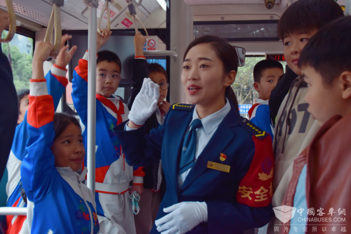 活动伊始,公交志愿者通过图文、视频等形式为学生们详细讲解车内坐好扶稳不打闹、下车小心观望来车、安全过马路等注意事项,进一步提高学生们的公共交通安全知识,培养文明出行的良好习惯。现场,学生们还依次走进车厢,坐进驾驶室,了解公交车盲区,学习使用灭火器、安全锤,了解如何在紧急情况下自救互救。