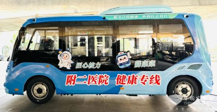 车身设计也是别具一格,融入了“服务百姓健康,承担社会责任”的理念。萌宝“蘇康康”和“核宝医生”的卡通形象,让公交车变得更加生动有趣。同时,车身上还有醒目的“附二医院 健康专线”文字标识,方便乘客快速识别并准确上车。