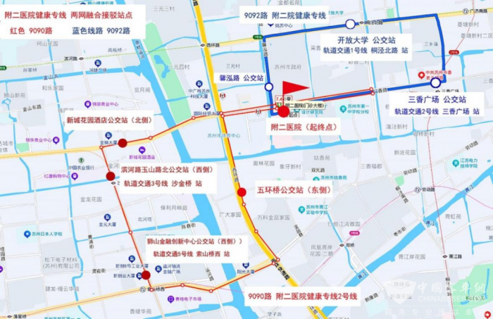 此外,9090路“附二院健康专线”还同时与2条轨道线路实现了无缝衔接。乘客可以在“滨河路玉山路北(西侧)”公交站换乘轨道交通3号线“沙金桥”站,或者在“狮山金融创新中心(西侧)”公交站换乘轨道交通5号线“索山桥西”站。自此,9090路与原有的9092路形成东西互补,以苏大附二院为中心,构建了“地面+地下”“公交+轨交”的立体交通线网,大幅度提升了医院公共交通的辐射面和便利性。