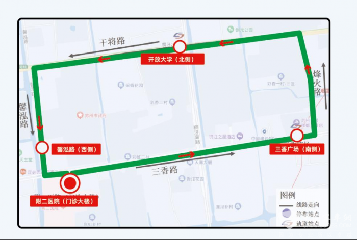 附二医院(门诊大楼)、三香广场(南侧)、开放大学(北侧)、馨泓路(西侧)、附二医院(门诊大楼)