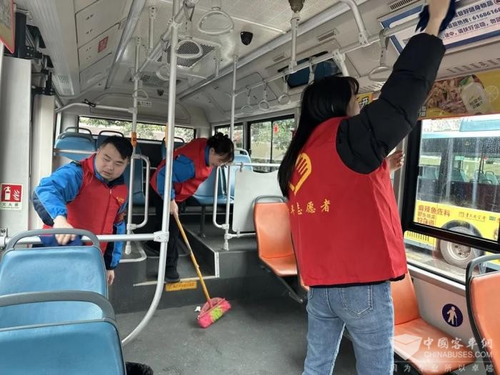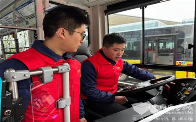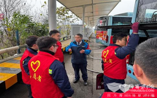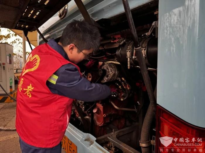 志愿者们对民心佳园公交站场的营运车辆进行“上线送修”服务,通过与驾驶员悉心交流,了解车辆情况、分享维保心得,并利用工具检修车辆,现场排除可操作故障,展示青年“车大夫”的责任担当,为春运筑牢平安防线。