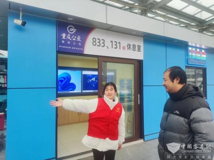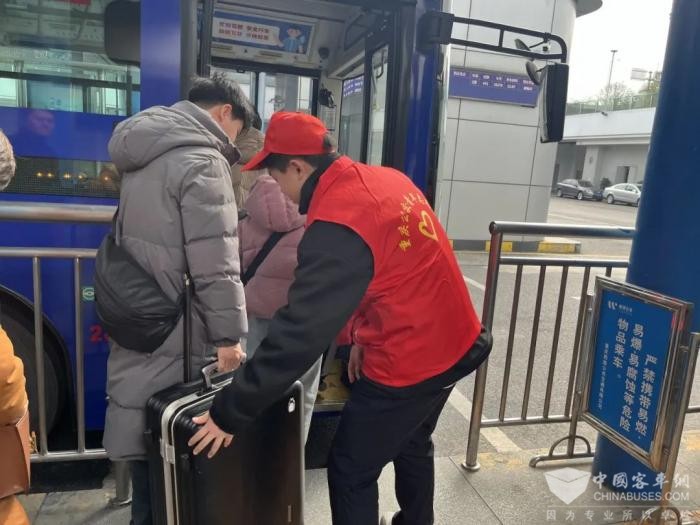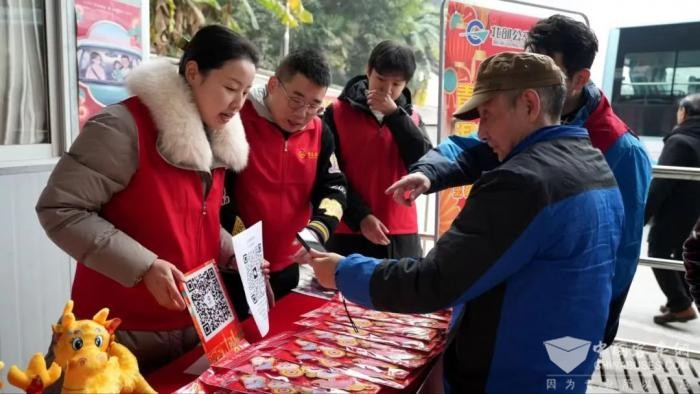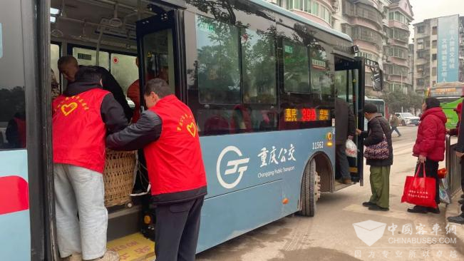 在南坪商圈珊瑚村站,志愿者们身穿红色马甲维护现场乘车秩序,向老年乘客宣传安全乘车知识,并为乘车的乘客送上新春祝福,营造安全温馨的乘车环境。
