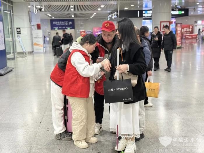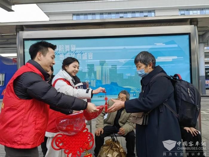 在北站北广场公交枢纽站站台,青年志愿者们积极开展赠送福字中国结、乘车引导等志愿服务,为市民春运回家路提供服务帮助。