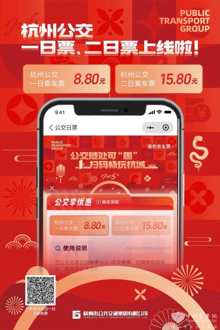 春节期间杭州公交也将继续推出“公交一日/二日乘车票”优惠出行服务,进一步方便游客根据自己的行程需求选择购买相应的乘车票,享受“无限次”乘坐公交车的便利。