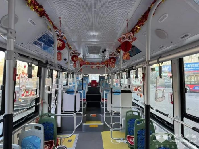 “这个春节,我要值6天班,每天要行驶100公里左右。”过年值班,隋磊特意把车厢装饰了一番:两侧玻璃贴上窗花,棚顶吊起拉花,座椅铺上暖垫。一对老夫妻上车后被喜庆的氛围吸引,一边拍着视频一边解说:“大家看看,这是大连的公交车。”