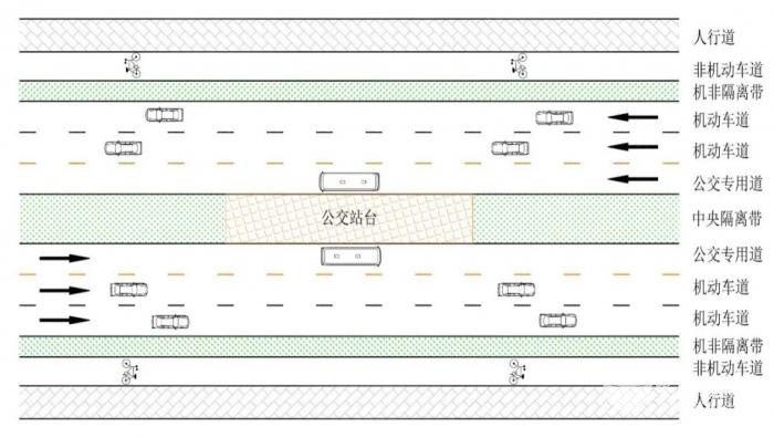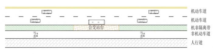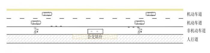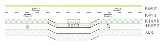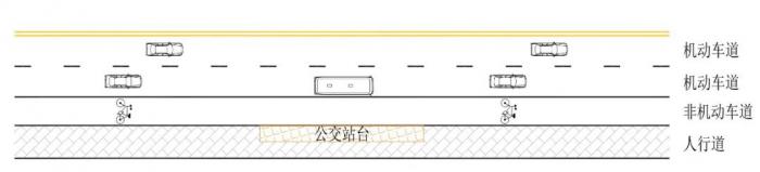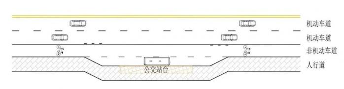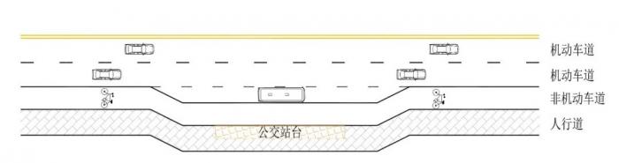 沿人行道设置的港湾式公交停靠站又可分为拓宽机动车道停靠公交车和拓宽非机动车道停靠公交车2种具体情形。