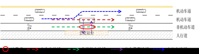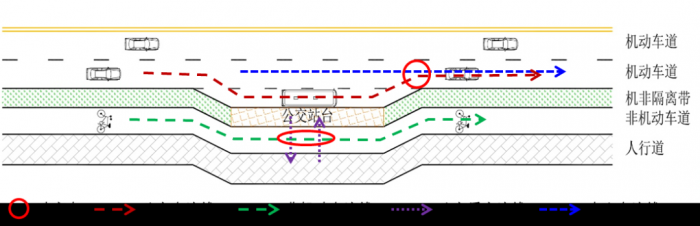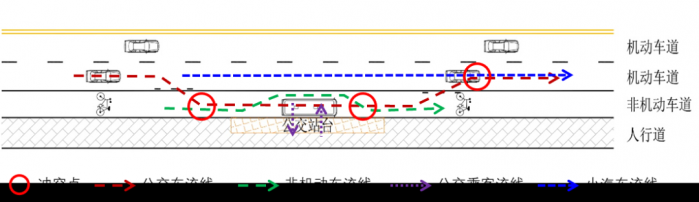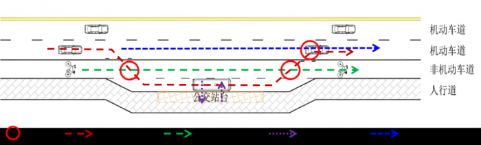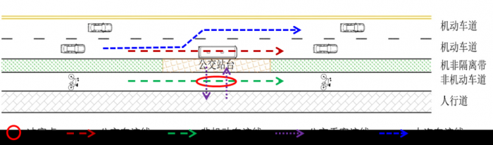 沿机非隔离带设置的直线式公交停靠站处的交通冲突主要是人行道至公交站台的公交乘客与非机动车之间的交通冲突。