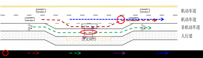 沿机非隔离带设置的港湾式公交停靠站处的交通冲突主要是人行道至公交站台的公交乘客与非机动车之间的交通冲突、出站公交车与小汽车的交通冲突。