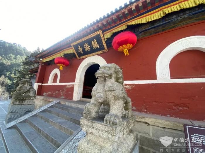 抵达五台山后,首先前往镇海寺,寺院建筑在两山合抱的一个石山嘴上,宛若一颗二龙嬉戏的宝珠。山豁口有苍老挺拔的大松树,走在松树林间的蹊径,再听飒飒的松风,给人一促静寞幽深的感觉。