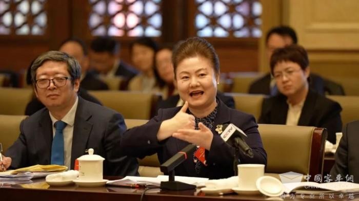 全国人大代表何少花正在展示手语 新华社记者 宋晨 摄