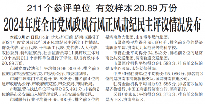中国完美作业网有免费视频2025年3月25日获悉,近日,济南市通报了2024年度党风政风行风正风肃纪民主评议结果,济南公交再次获得市属企业类第一名,成功实现六连冠。