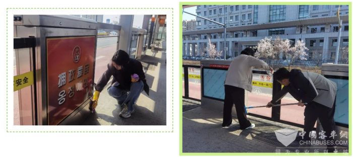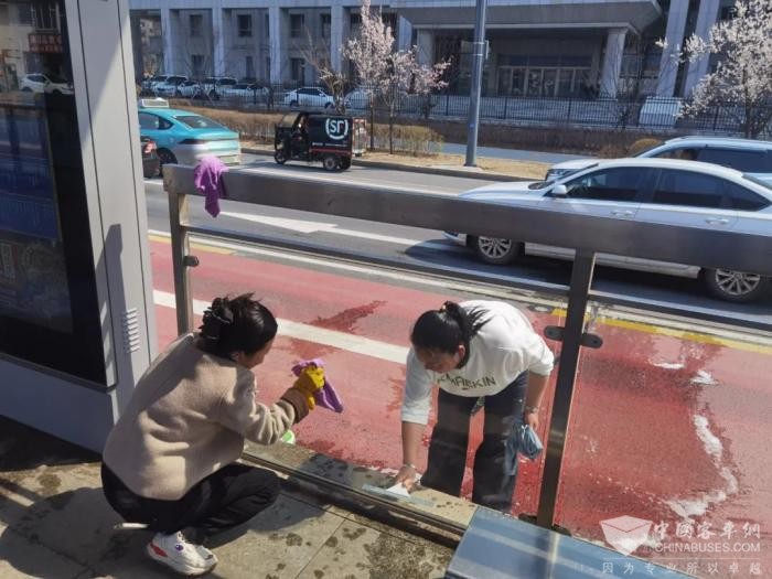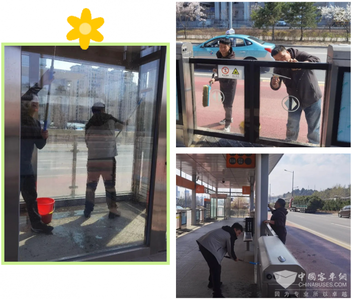 当天下午,志愿者们手持抹布、扫帚、玻璃刮等清洁工具,分组对各BRT站台进行全面细致的清理。她们有的清洁候车座椅、有的擦拭站台玻璃、有的清理地面杂物,确保每个角落都干净整洁。经过大家的共同努力,站台焕然一新,整洁的候车环境令人赏心悦目。