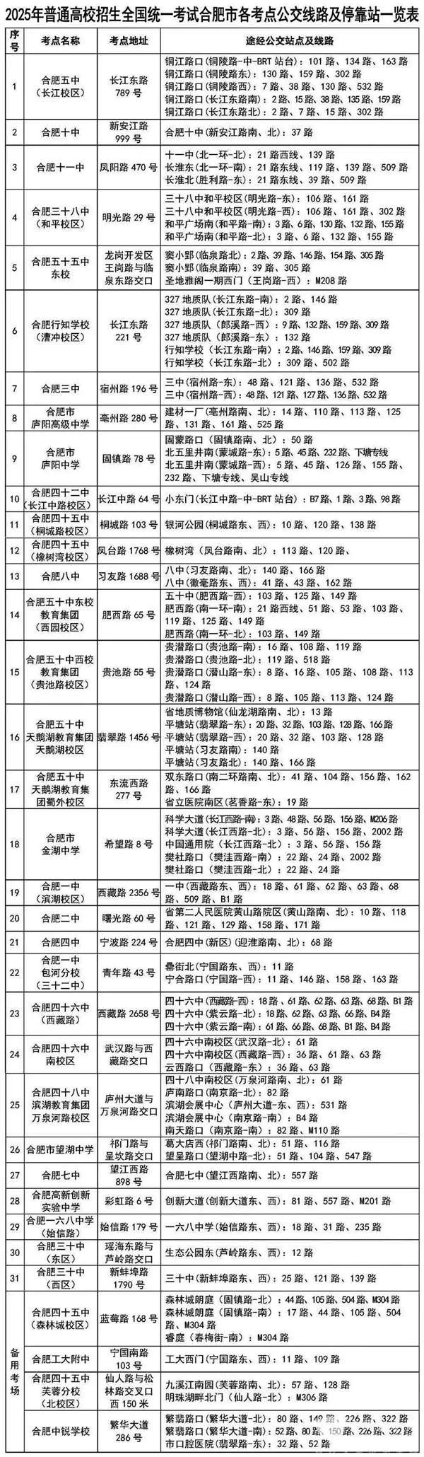 为方便广大考生高考期间顺利出行,合肥公交集团逐一列出途经省城31个考点及4个备用考点的公交线路、停靠站点,方便考生乘坐公交车赶赴考场应试。