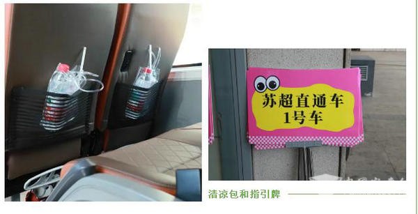 当球迷们排着队,满怀期待的登上贴着“南哥来了”的苏超直通车,座位前摆放的“清凉包”立刻映入眼帘——里面装着风油精、消毒湿巾、矿泉水、还有一把小扇子。“天儿热,大家注意别中暑!”工作人员一边帮年纪大的球迷放行李,一边提醒大家系好安全带。车站检票员为所有旅客发放了提示纸条,上面写有车号、车牌号、驾驶员联系方式等信息,方便球迷观赛结束后可以及时寻找到自己的车辆。16:05,6辆直通车平稳驶出车站,空调的凉风里混着淡淡的薄荷香,原本燥热的旅途时光,成了球迷们赛前“侃球”的好机会,车厢里不时爆发出阵阵笑声。