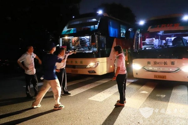 22:00左右,比赛结束,观赛球迷陆续来到大客车停车场,由于车辆较多,停车位置较为松散,工作人员和驾驶员提前在车前为球迷提供指引,让他们能够快速找到自己的车号。三号车有一位球迷迟迟没有到达,驾驶员立刻与该球迷进行联系,得知其所在位置距离停车场较远,当即决定所有车辆立即出发返回,由随行的备用车前去接该球迷返回南京。23:50,所有车辆全部安全驶入南京汽车客运站,此次苏超南京——扬州赛事直通车运输任务圆满完成。