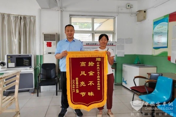 近日,保定曲阳的郑女士携带一面印有“拾金不昧,高风亮节”字样的锦旗,专程前往六路车队,向车长赵金磊致以深切的感激之情。