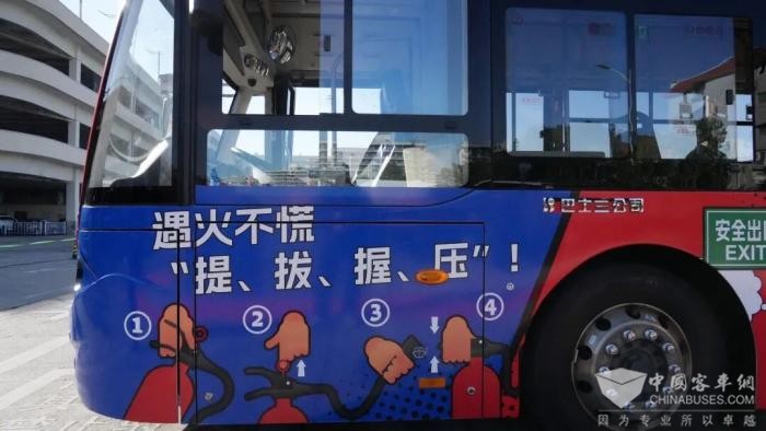 消防巴士车身采用消防标志性的红蓝两色、橙黄亮色为主色调,搭配“全民消防,生命至上——安全用火用电”消防宣传月主题标语和防火提示,成为穿梭在城市中亮眼的“移动消防宣传站”。车厢内聚焦沉浸式消防互动空间打造:座位椅背和扶手拉环分别贴有通俗易懂的消防小贴士,内容涵盖用火用电规范、家庭防火技巧、火灾逃生要点、消防器材使用等关键领域;车内挡板设置生动有趣的消防安全问答,与椅背提示形成互补,让乘客沉浸在全景式消防空间中,在潜移默化中学习消防知识。