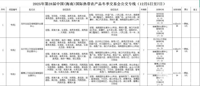 据了解,为方便市民游客前往冬交会现场,海口公交开通专线1(龙华总站至海南国际会展中心)、专线2(白沙坊公交场站至海南国际会展中心)、专线3(椰博公交场站至海南国际会展中心)等3条冬交会公交专线。保障时间为市区始发站首班8:00、末班16:30,海南国际会展中心首班9:00、末班17:30,发车间隔为每班30-40分钟,根据实时客流动态发班,票价实行一票制5元。