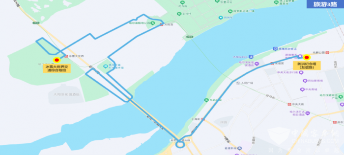 其二为旅游3路,为常规收费线路,票价2元/人次。线路走向,为由冰雪大世界B2停车场(交通综合枢纽)发车,经雪景街、科技馆、太阳大道、极地馆、月亮一路、月亮二路、天马街、天马隧道、雪花路、松北大道、公路大桥、友谊路,至中央大街终点。服务时间为首车7时,末车20时。