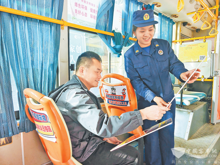 专线车辆车厢内壁均张贴了色彩鲜明、内容详实的消防宣传海报,涵盖家庭防火要点、电动车安全充电规范、火场逃生自救技巧、灭火器正确操作方法等实用性强的安全知识,让乘客在乘车途中即可学习消防知识。