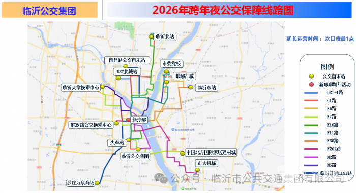 12月31日晚,对途经新琅琊、万象汇、河东吾悦广场等庆祝活动举办地的10条线路延长运营时间至次日凌晨1:00,具体包括:BRT-1路、G1路、K6路、K7路、K10路、K11路、K30路、K201路、N2路、N5路。