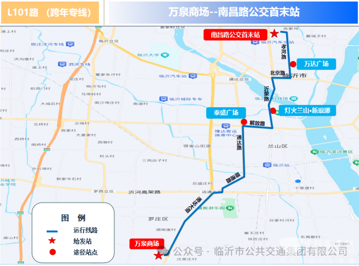 线路途经:L101路由罗庄区万泉商场发往南昌路公交首末站,途经通达南路、解放路、沂蒙路、北京路、孝河路、南昌路。串联泰盛广场、新琅琊、北城万达广场、齐鲁园广场等核心商业景点。