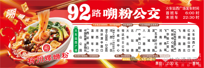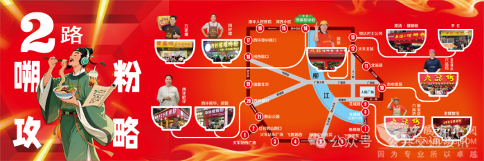 专线最大的亮点在于全面升级的“嗍粉导览”功能。线路示意图不再只是站名排列,而是化身为一幅“柳州螺蛳粉美食人文地图”,清晰标注沿途各站点附近的网红螺蛳粉实体店,并通过招商形式展示部分柳州螺蛳粉实体店形象代言人的照片。
