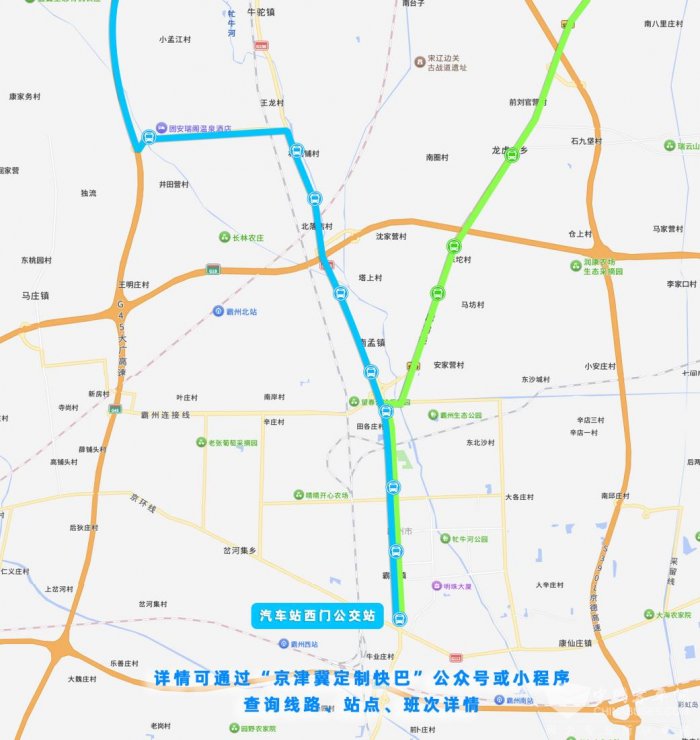 北京往返霸州定制快巴线路规划精准覆盖两地关键交通枢纽与人口密集区域,共设置两条主线,全长约90公里。