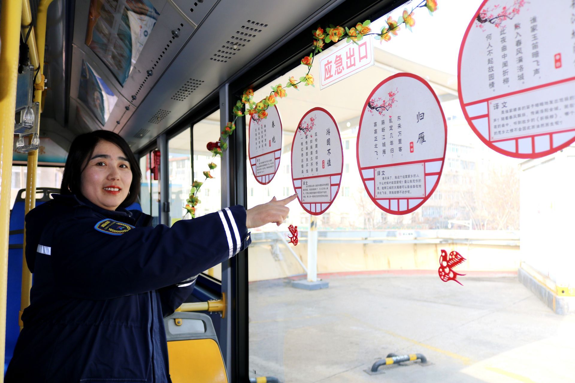 最富巧思的是车窗上精心张贴的经典春日诗词。“春眠不觉晓,处处闻啼鸟”“春风如贵客,一到便繁华”……一句句耳熟能详的诗句,让乘客在抬手投足、移步换景间,便能品读春的韵律。这趟行驶在城市脉络中的公交,不再仅仅是交通工具,更成为了一个移动的“传统文化展廊”,让市民在碎片化的出行时间里,感受到中华节气文化的深厚底蕴与诗意浪漫。