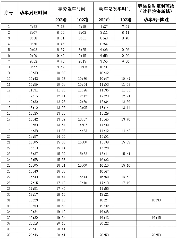 本次服务优化主要围绕线路动态匹配与专项接驳供给展开。一方面,通过实时对接动车时刻表,对途经动车站的102路、202路公交班次进行动态调整,实现公交运力与列车到站高峰时段精准匹配,减少旅客候车时间。另一方面,在2月2日至3月13日春运期间,临时开通“动车站—健跳(途经滨海科技城)”夜间定制接驳专线,进一步满足前往县城及相关换乘节点的旅客出行需求。