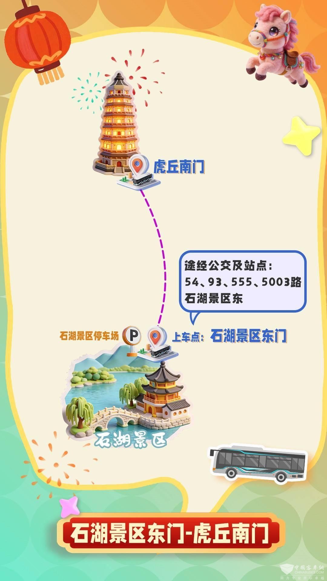 每逢节庆,热门景区周边交通拥堵、停车一位难求,往往成为市民出游的“头疼事”。为缓解景区周边交通压力、提升市民出行体验,苏州公交集团此次创新推出“定制赏灯专线”,鼓励市民选择集约化公交出行,减少自驾带来的拥堵与停车困扰。四条专线分别以石湖景区东门、相城区繁花中心、高新区狮山文化广场、工业园区苏州中心为起点,直达虎丘南门,市民可就近选择上车点,直达赏灯目的地。