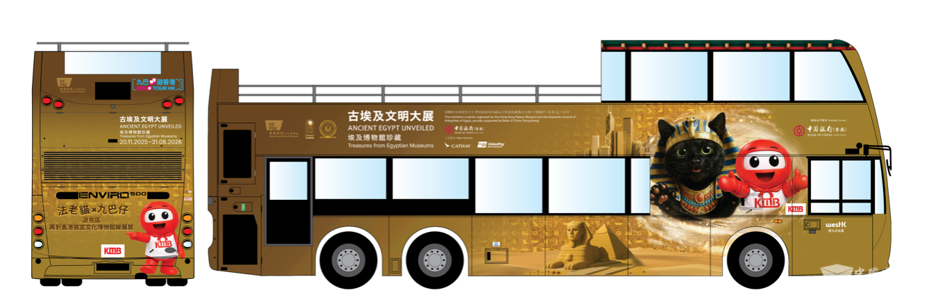 “九巴法老猫号”将于3月7日起正式投入服务,为期一个月,10辆主题巴士将分别行走于途经西九文化区的路线,包括“九巴游香港”HK1开篷巴士、上月开办连接西九文化区的“宠物巴士团”、W4 [ 高铁(西九龙站)⇋ 尖沙咀(循环线)] 及296D [ 尚德 ⇋ 九龙站 ]。“九巴法老猫号”披上古埃及主题车身设计,除了生动展现两位可爱小主角“九巴仔”与“法老猫”, 更融入金字塔、蓝色河马、狮身人面像及圣书体符号等文化元素。