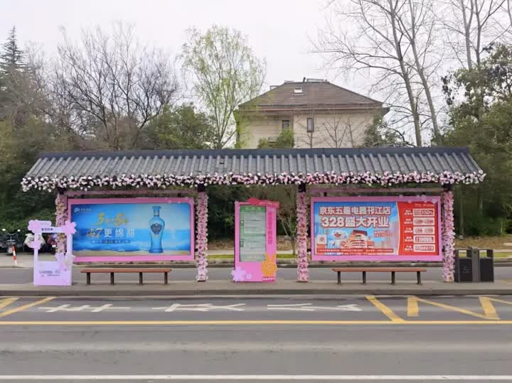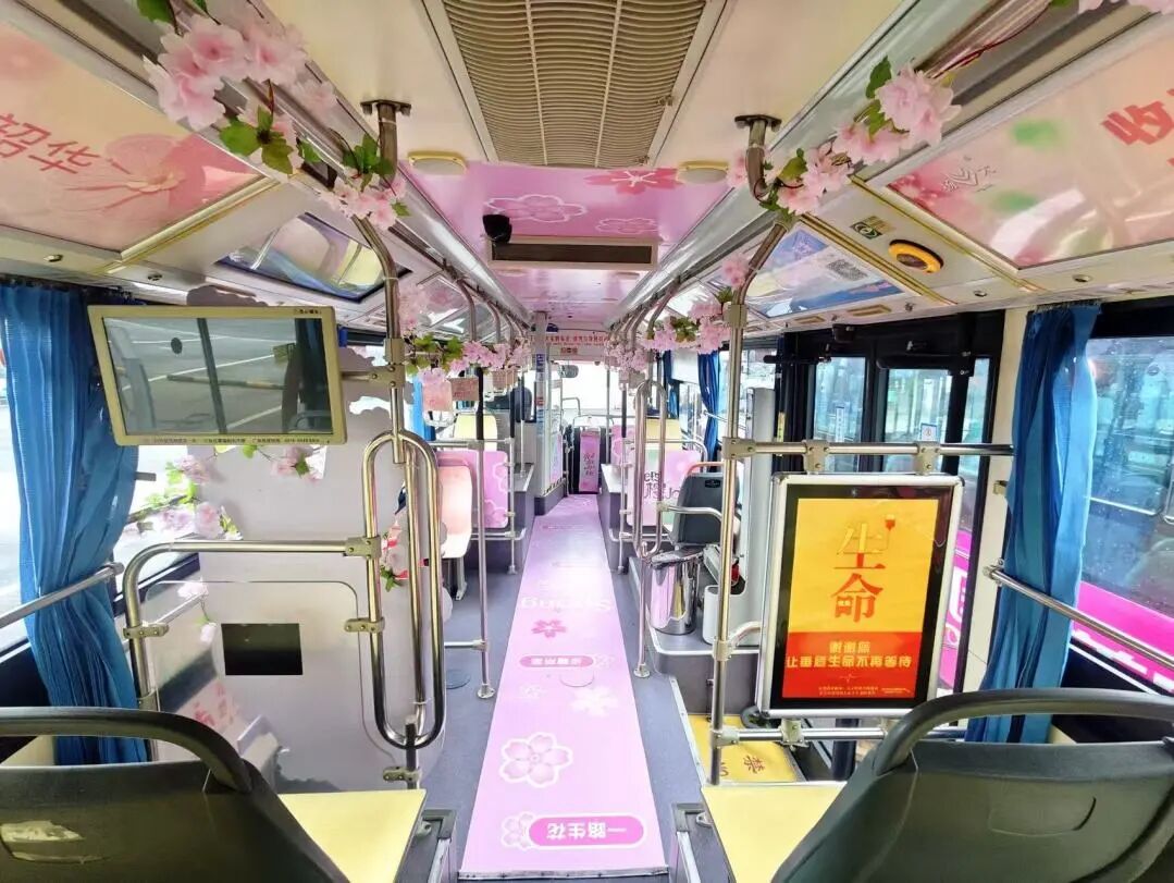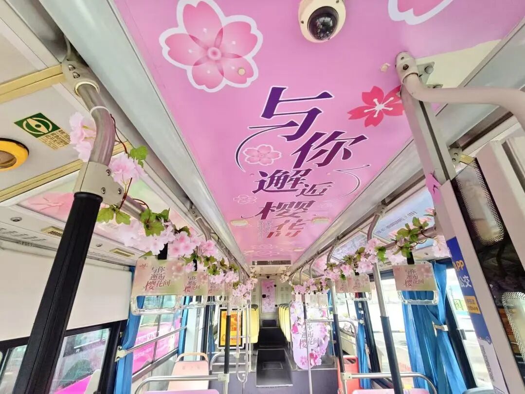 以粉白樱花为底色,搭配“与你邂逅樱花间”的暖心标语,将春日诗意与城市底蕴藏于车身与站台上,让赏樱专线都成为移动的“樱花风景”。