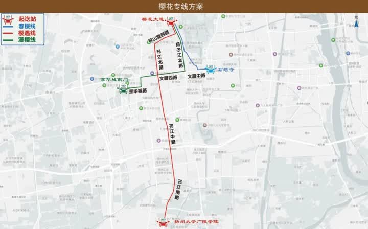 注:三条樱花专线途经公交站点均正常停靠上下客,车辆位置信息可在扬州掌上公交APP查询,如遇交阻等状况可能造成发车时间延误,请您耐心等待。