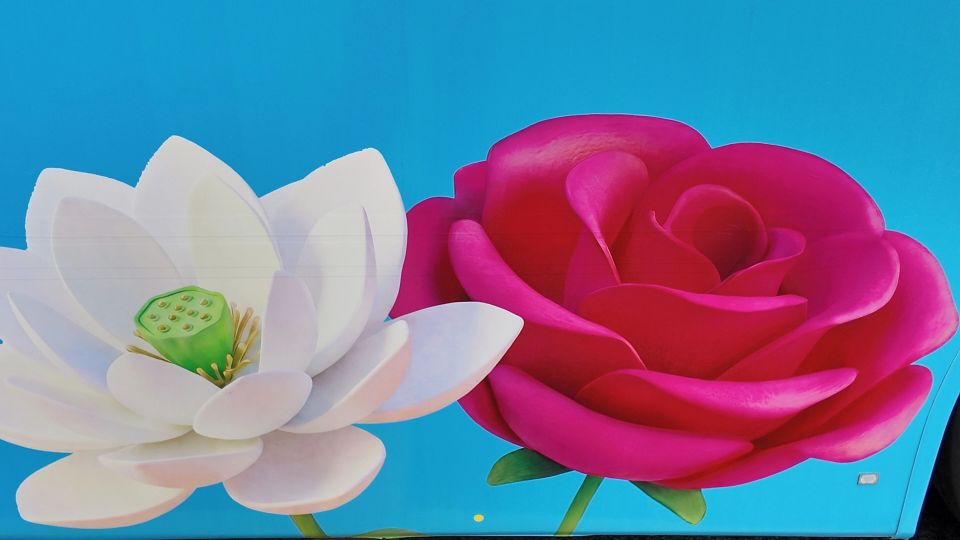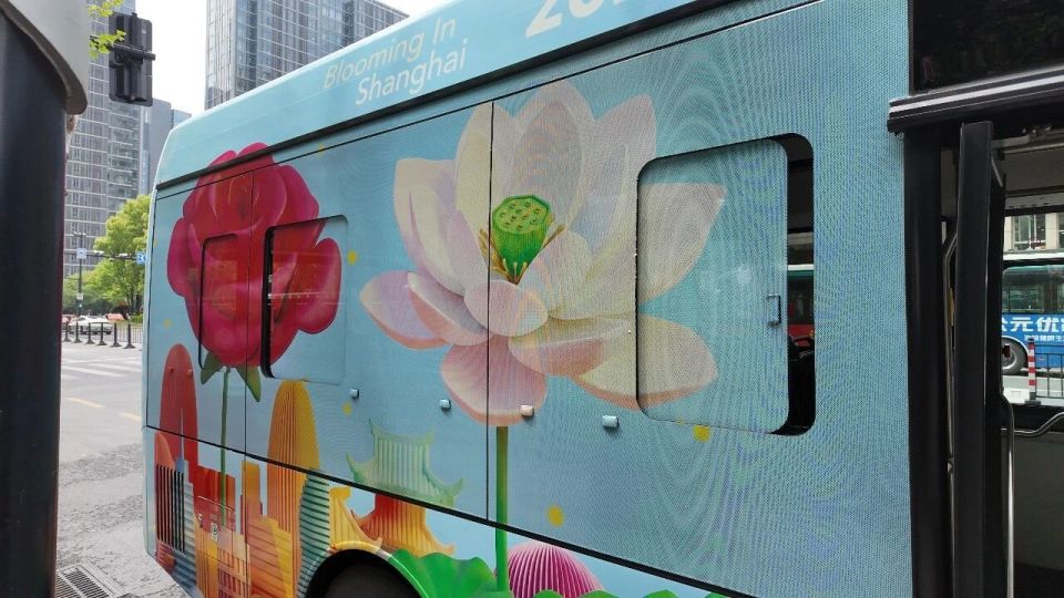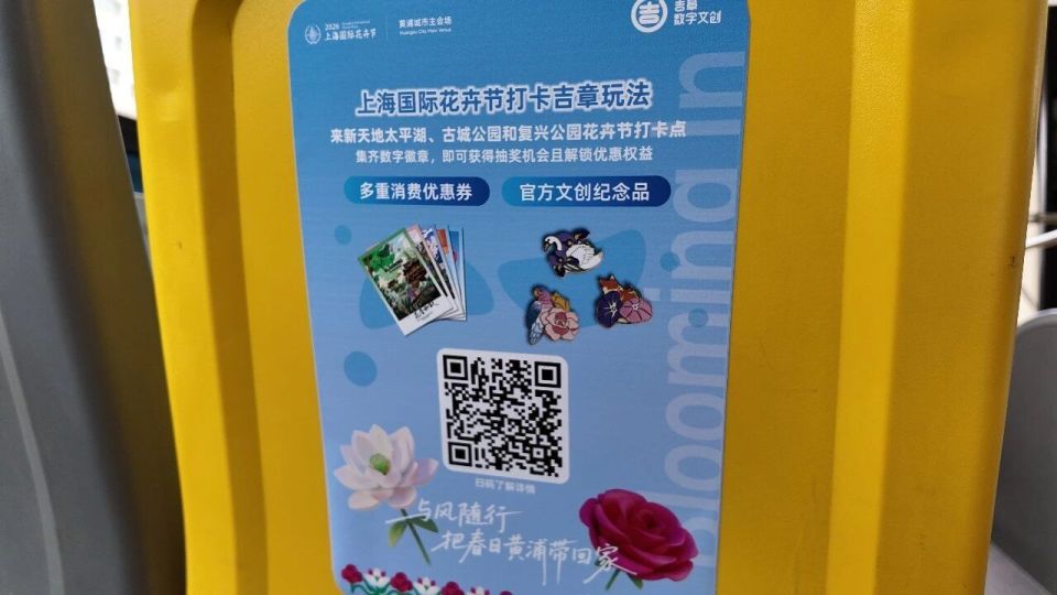 记者在现场看到,这辆 “移动大花车”有着清新的天蓝色车身,绘着盛放的荷花与玫瑰,搭配黄浦区地标剪影,还有 “花开满城 时光回响” 的字样,浪漫感直接拉满!车身顶部还标注了 “2026 04.18—05.10” 的专属运营时段,和沿途的春日繁花交相辉映,妥妥的街头限定风景线~