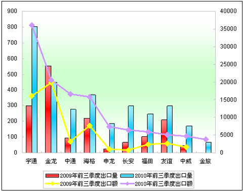 三、2010年前三季度客车行业公交车出口情况比较分析