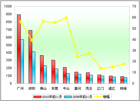 图3:2010年前11月广东区域前10名城市销售增长统计图