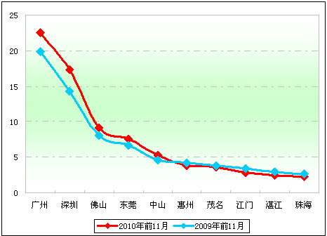 在广东区域内21个地级城市中,广州销量最大,达897辆,占总量的22.5%,2009年前11月销售574辆,占2009年前11月的19.9%,占有率提高了2.6个百分点,同比增长了56.27%左右;其次是深圳销量690辆,占总量的17.3%,2009年前11月销售412辆,占前11月总量14.26%,销量同比增长39.3%;再次是佛山销售366辆,占总量的9.18%,2009年前11月销售234辆,占有份额为8.1%,同比增长56.4%;东莞销量排名第4,销量为303辆,占总量的7.6%,2009年前11月为195辆,占总量的6.7%,销量同比增幅55.4%;销量第五的是中山,销量为211辆,占总量的5.3%,2009年前11月为132辆,占总量的4.6%,同比销量增幅为59.8%,增幅在所有的城市中为最大;销量排第六的是惠州,销量为152辆,占总量的3.8%,2009年前11月为122辆,占总量的4.2%,销量同比增幅24.6%;销量排在第七的是茂名,销量为143辆,占总量的3.6%,而2009年前11月销量为112辆,销量同比增幅为27.7%,占据总量的3.87%;销量排名第八的是江门,销量为115辆,占据总量的2.9%,2009年前11月销量为101辆,占总量的3.49%,销量同比增幅为13.9%,是广东销量前10名中增幅最小的;销量排名第九的是湛江,销量为99辆,占总量的2.5%,2009年前11月销量为86辆,销量同比增幅为15.1%,占据总量的2.98%;销量排名第十的是珠海,销量为93辆,占据总量的2.3%,2009年前11月销量为79辆,销量增幅为17.7%,占据总量的2.7%。
