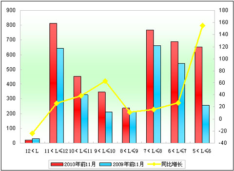 三、2010年前11月广东公路客车在各长度段的销售特点分析