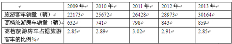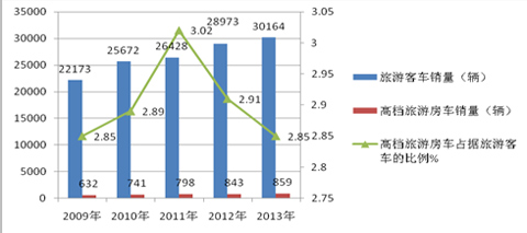 2、高档旅游房车的销量也在逐年增长,但占据旅游客车市场的比例并不是在逐年增长,2009年-2011年的比例一直是呈现上升态势,即从2009年的2.85%逐年上升到2011年的3.02%,但之后从2011年起到2013年却是逐年下降的,即从2011年的3.02%逐年下降到2013年的2.85%。
