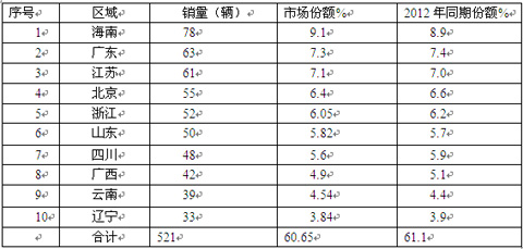 1、2013年前10月前10名区域市场的房车销量为521辆,占据全国房车市场的份额为60.65%,比2012年同期降低了0.45个百分点。