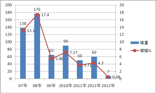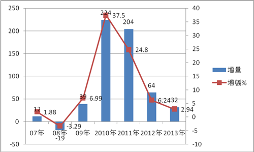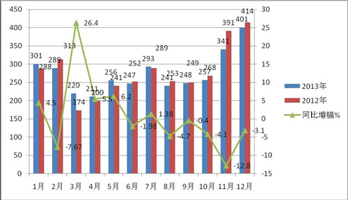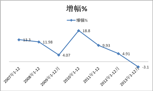 一、2013年前7月销量增幅有正有负,起伏不定,8月后各月销量增幅均为负值,总体市场呈现萎缩低迷态势