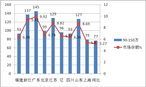 5、山东是高端客车市场需求量第四大的区域市场,整体集中度为9.02%.具体为:对价格在90-150万区段的需求的集中度是8.69%,对价格在150-200万的区段的需求的集中度为8.56%,对价格在200万以上的区段的需求的集中度是9.14%,.也就是说,在山东区域市场,价格在90-150万集中度次小, 150-200万区间的产品市场集中度最小,200万以上最大,但市场份额仍然不小,因此,高端客车生产企业对山东区域的营销策略也不容忽视,因为该区域对高端客车市场需求的机会也不小,主要因为山东是沿海发达的区域之一, 青岛、威海、烟台等旅游市场也很发达,无疑拉动了对高端客车市场的需求。