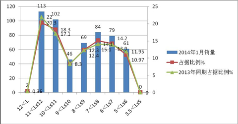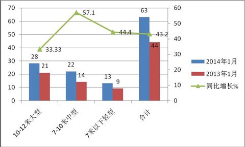 1、按长度车型划分,大、中、轻销量在2014年1月同比均呈现正增长,且幅度均超出30%以上。