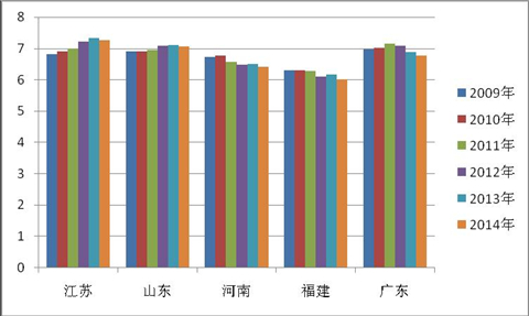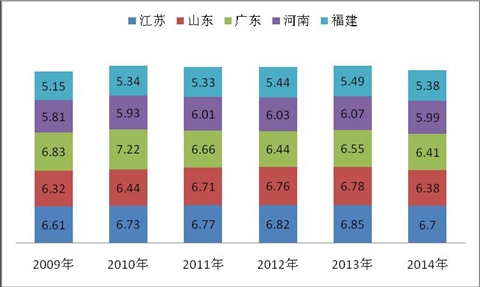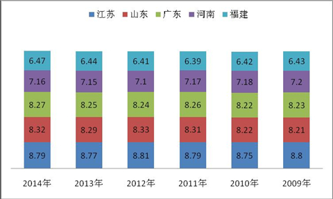 3、从近6年来1月5大主流区域座位客车销量的份额之和看,江苏位居第一,广东位居第二,山东位居第三、河南位居第四,福建位居第五,市场份额排位基本与该区域的经济状况和人口总量规模大小相匹配。